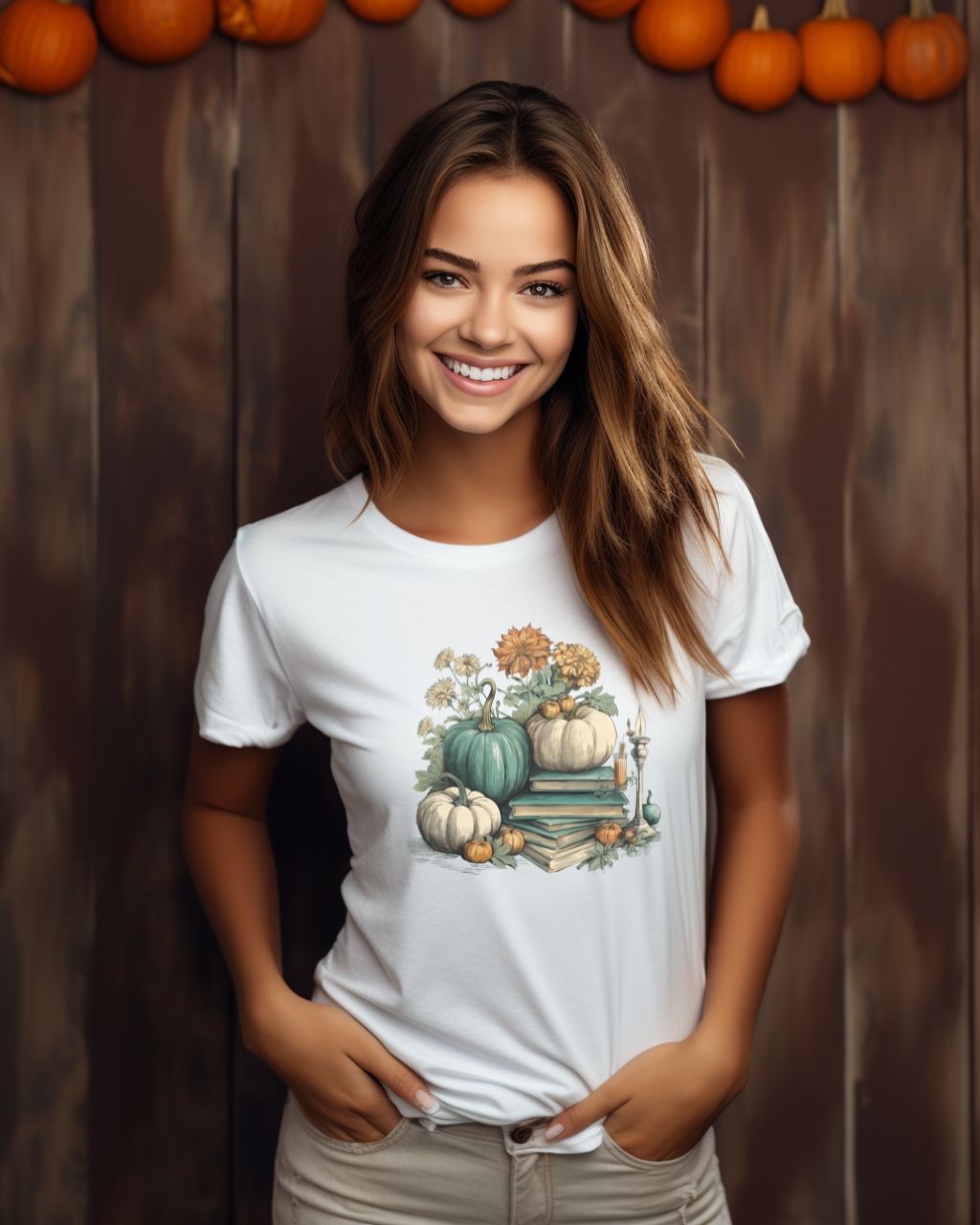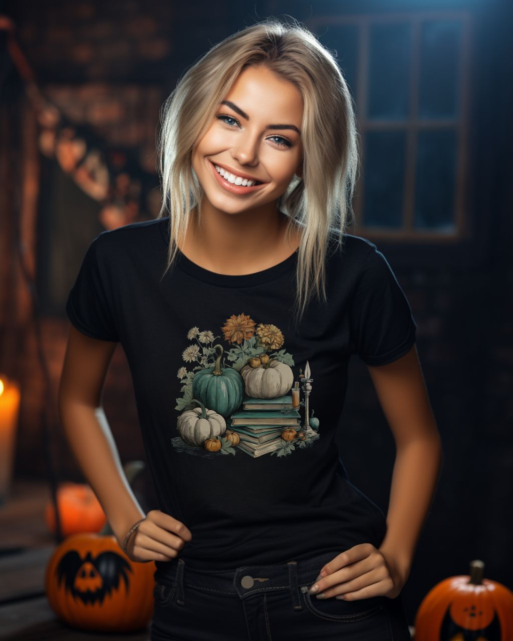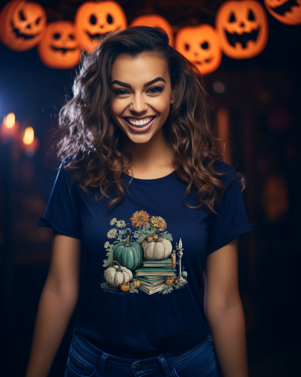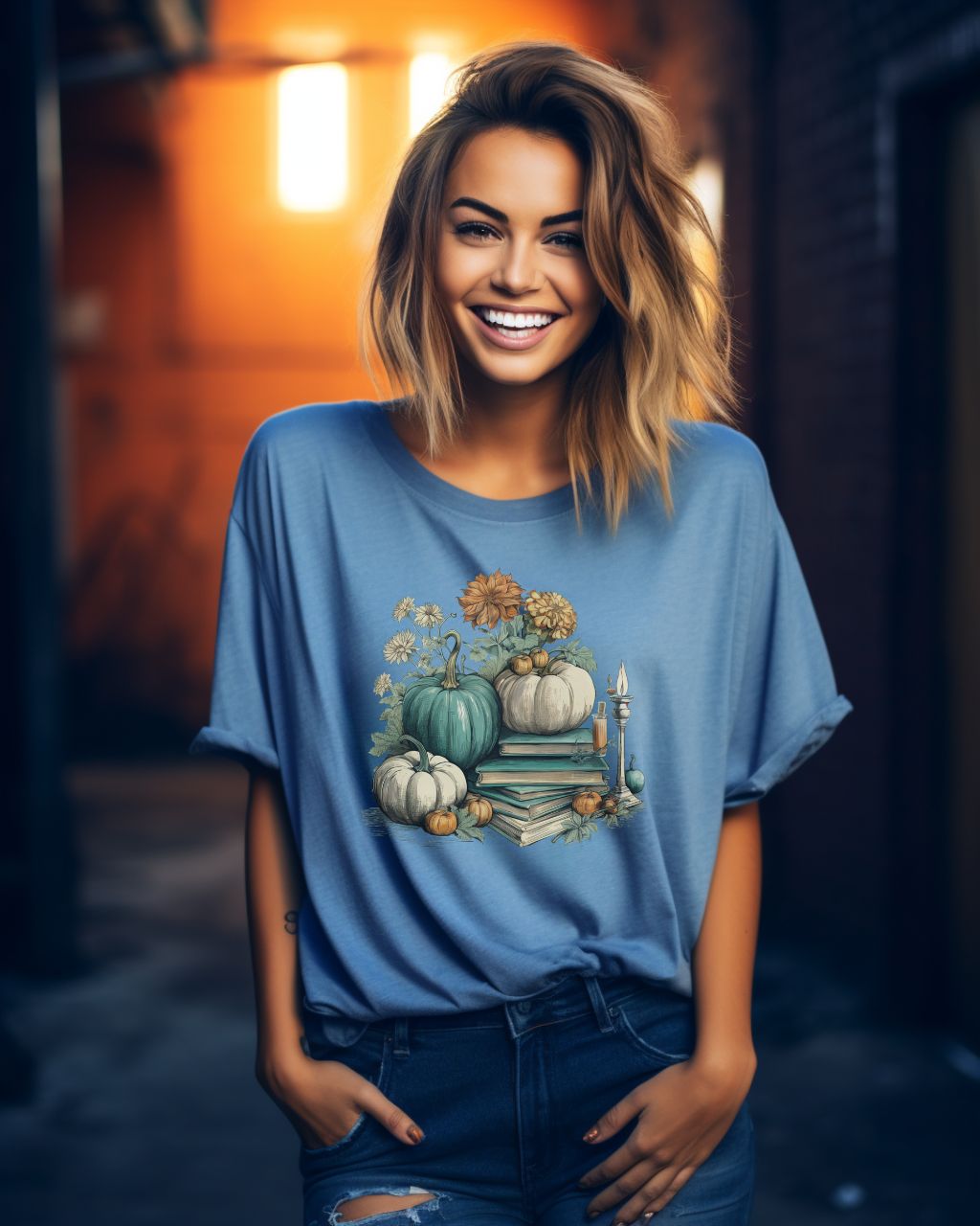 This teal and cream t-shirt is perfect for the fall season. Featuring a subtle vintage watercolor print, the design offers a cozy and warm feel with its soft comfort colors. Get into the Halloween spirit with this bookish t-shirt and enjoy the fall vibes!