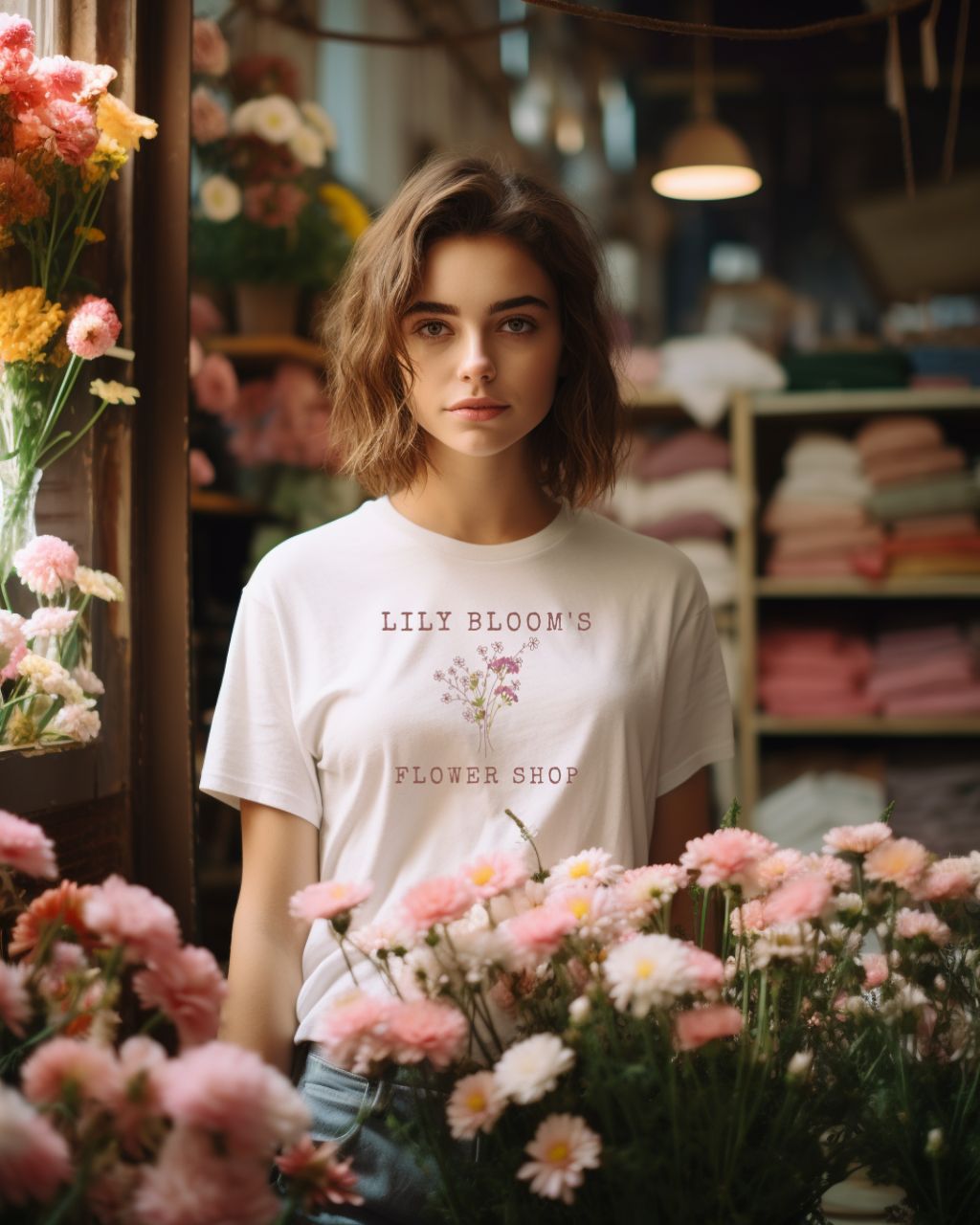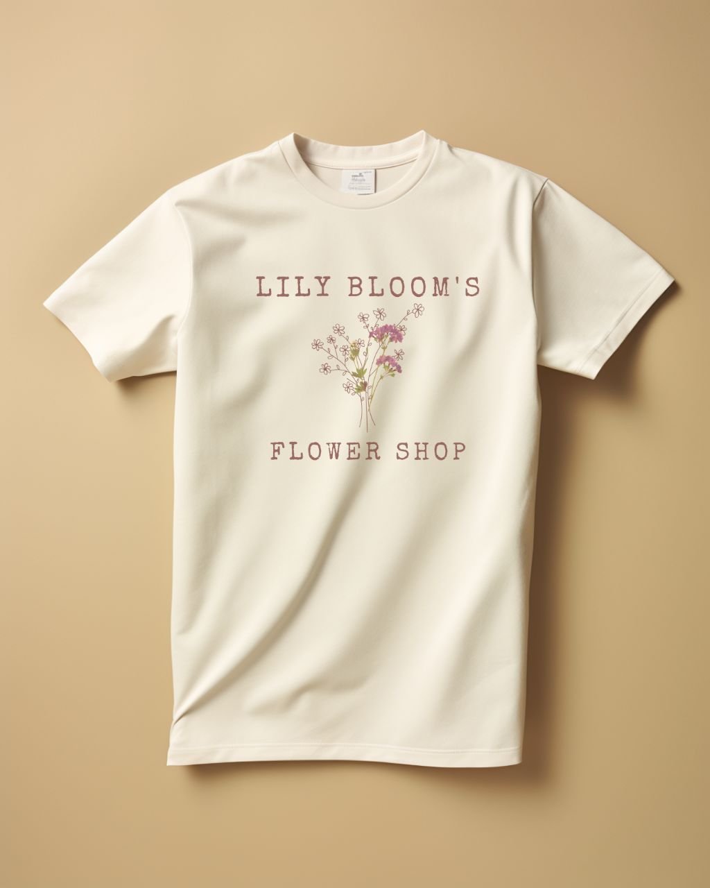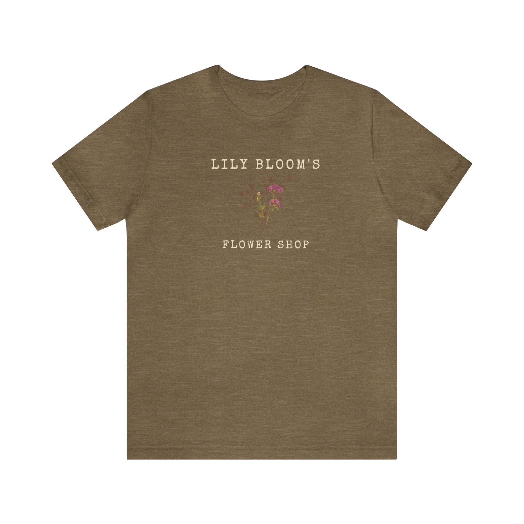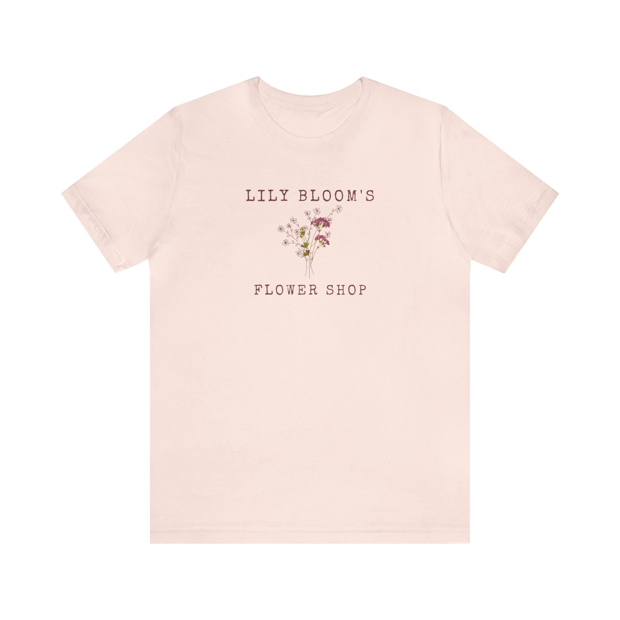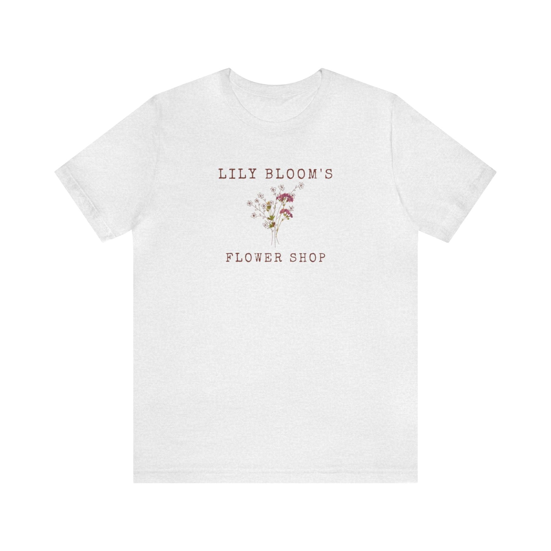 Our latest shirt design inspired by the book it ends with us - the "Lily Blooms" shirt with "Flower Shop" text. This shirt features a lovely bouquet of lilies in full bloom, with the words "Lily Blooms" written underneath in a clean and modern font. Below the bouquet, you'll find the text "Flower Shop" in bold lettering, giving it a professional and sophisticated look.