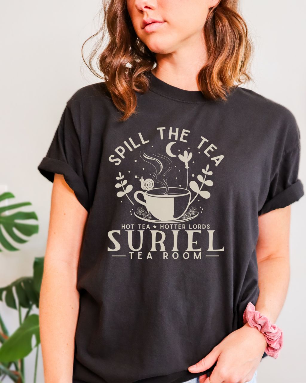 Shop our ACOTAR Suriel's Tea T-Shirt, a tribute to the whimsical world of Sarah J. Maas's 'A Court of Thorns and Roses. Sip on the essence of this beloved character while donning our comfortable, fantasy-inspired tee. It's a wearable piece of ACOTAR magic that every fan will adore!