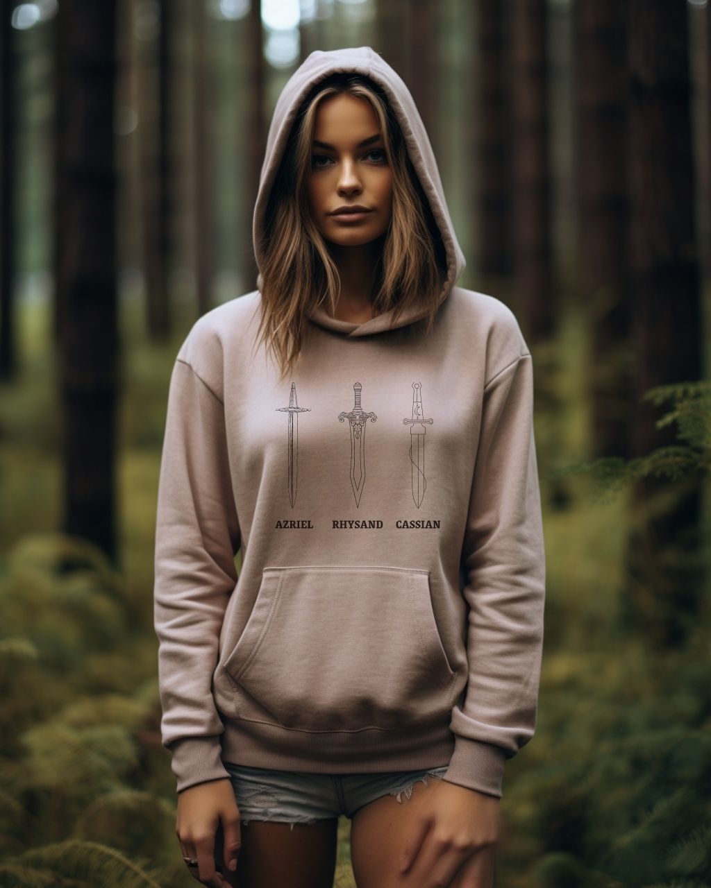 Introducing our stunning A Court of Thorns and Roses inspired hoodie, a true homage to the captivating world of Prythian! This shirt beautifully showcases the emblematic swords of three beloved characters: Azriel, Cassian, and Rhysand.