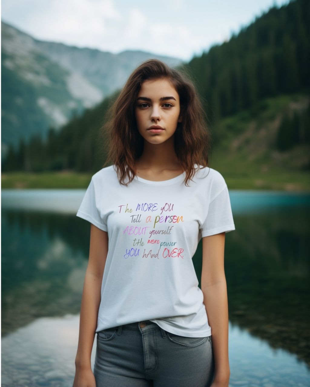 Featuring a unique and eye-catching design, this stylish t-shirt showcases a quote from the book "the more you tell a person about yourself, the more power you hand over" in colorful typography. It's a great reminder to protect your personal information and maintain control over your life.