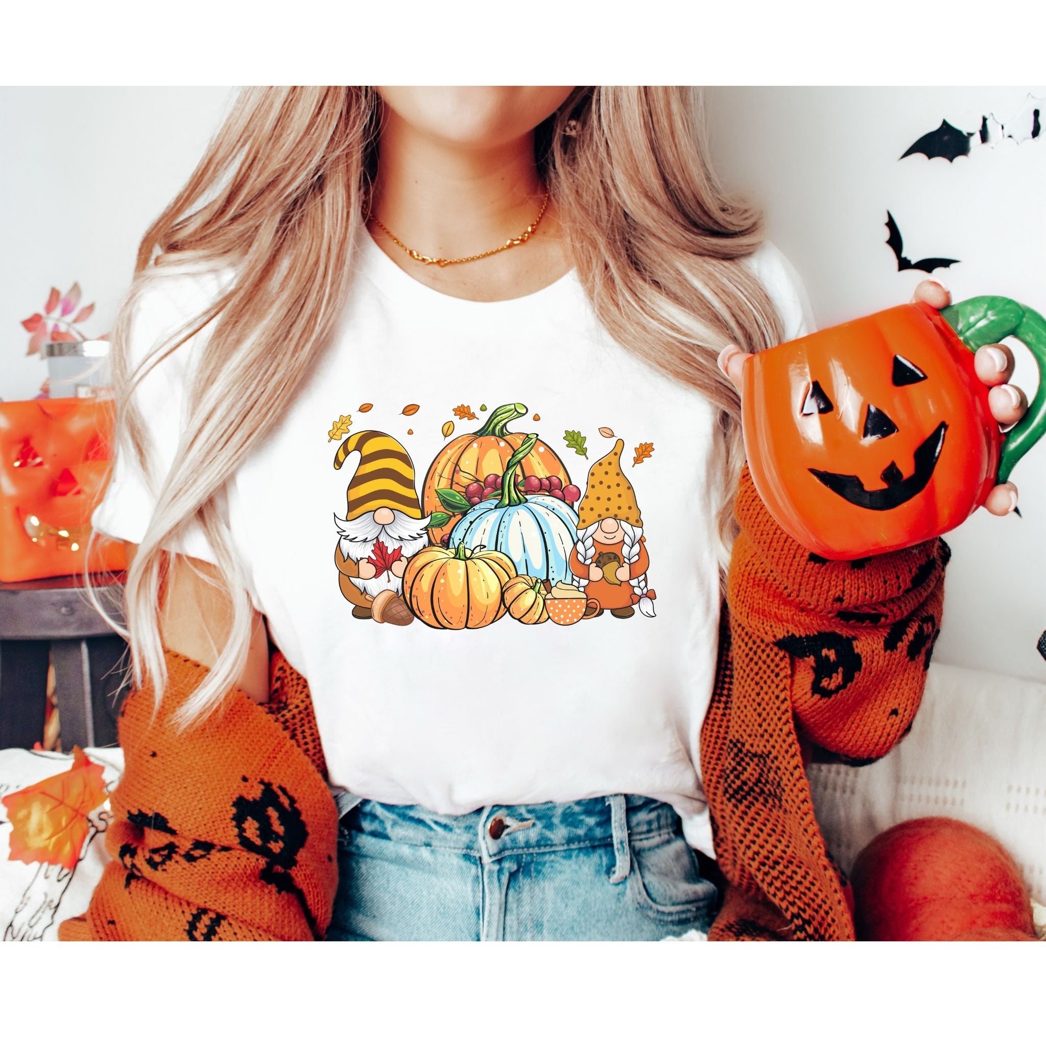 This cute t-shirt is the perfect halloween gift to a friend, mom, girlfriend, & best friend who loves gnome, pumpkins and cute things! The classic short sleeve tee fits like a well-loved favorite with its soft cotton and quality print that make users fall in love with it over and over again. These t-shirts have ribbed knit collars to bolster shaping. The shoulders have taping for better fit over time. Dual side seems hold the garment's shape for longer.